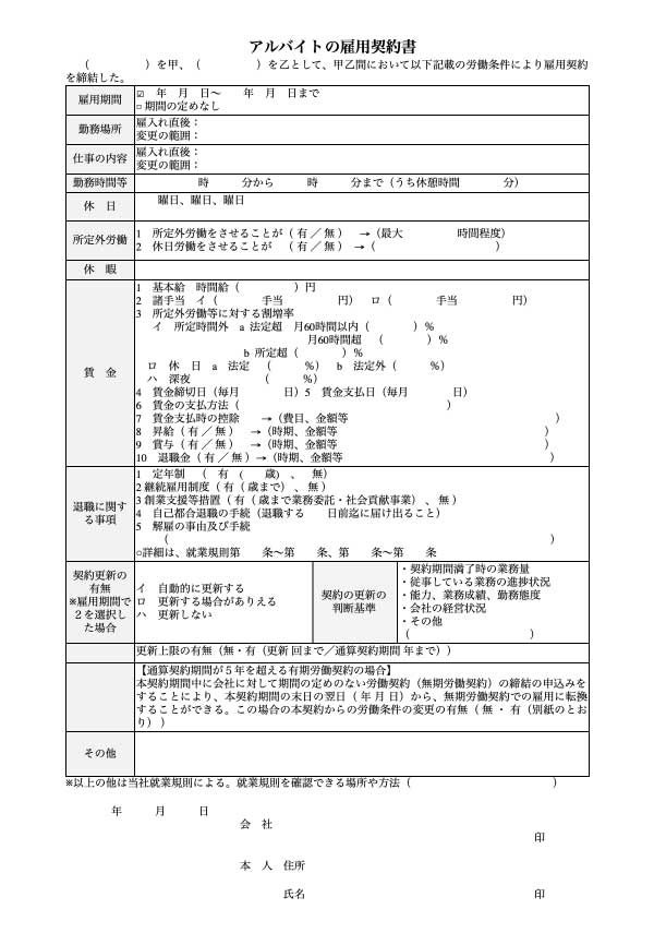 アルバイトの雇用契約書